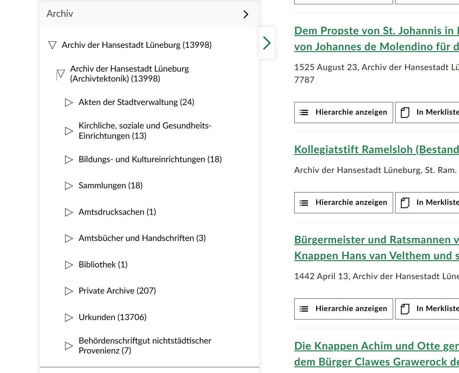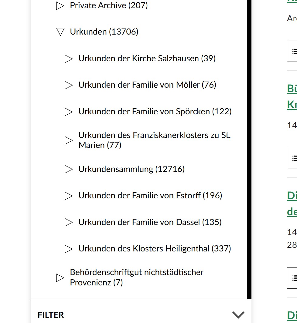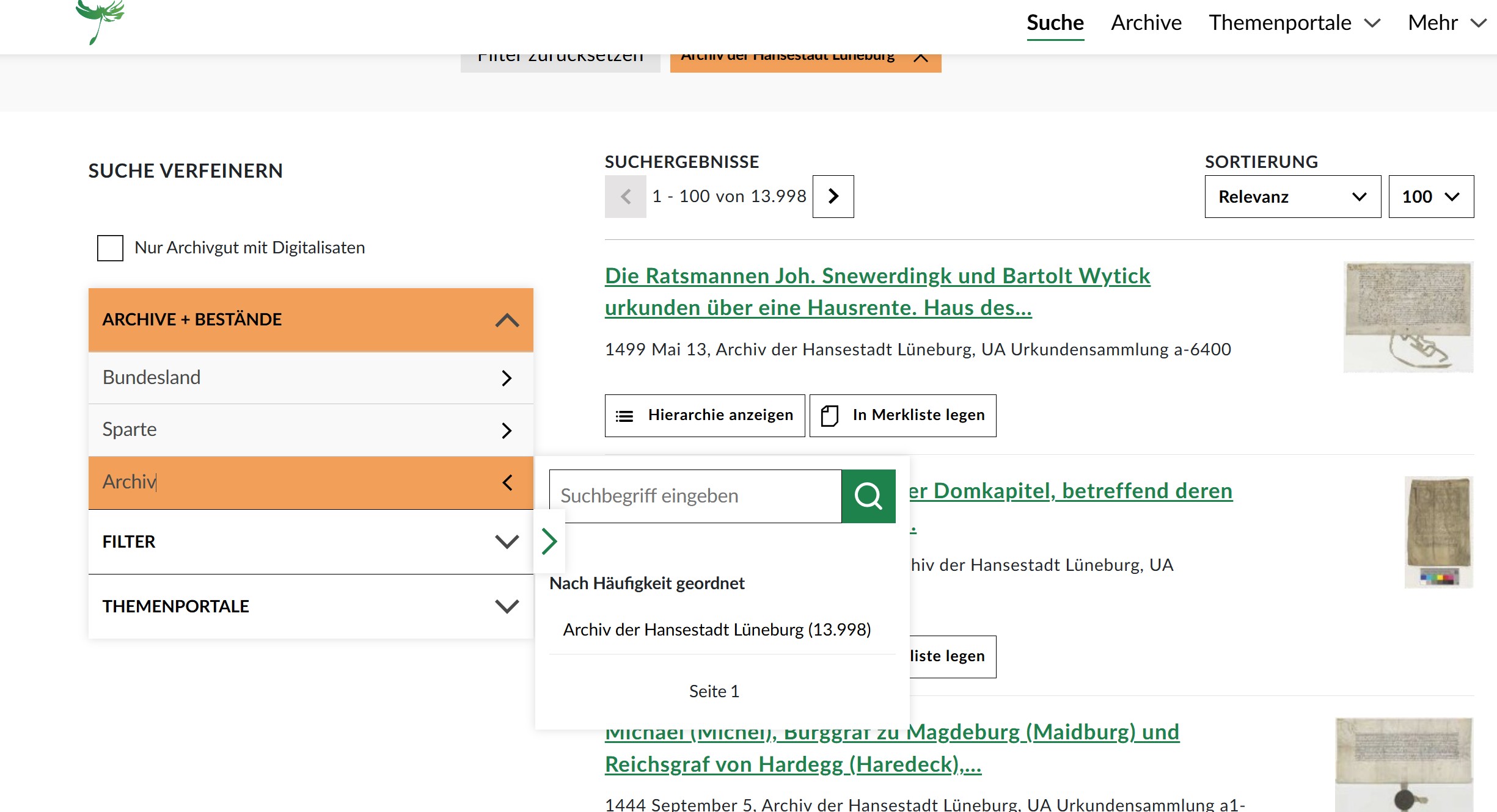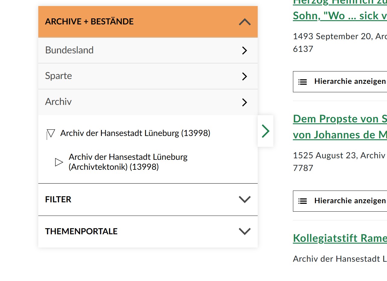 - Links bei "Suche verfeinern" bei dem entsprechenden Archiv auf das kleine Dreieck klicken, dadurch öffnet sich ein Unterordner